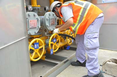 20分鐘后,然氣搶險隊及時趕到現場,立即進行一系列搶修工作。拉起警戒線,架起吹風機,穿戴防毒面罩,主要技術人員立即到泄漏點了解泄漏原因。但由于此時,現場天然氣濃度不斷升高,潛在爆炸危險,而且然氣靠近作業區,機器仍在運行當中。然而搶險人員處變不驚,一邊迅速從然氣總閥進行引流,將泄漏煤氣從安全管道排出,降低車間然氣濃度,在空曠位置燃燒揮發;另一邊則進行泄漏點維修,及時堵塞泄漏點,制止事故發生。
